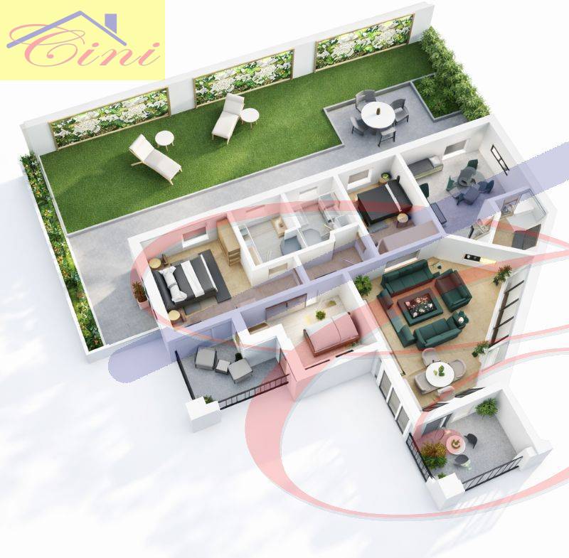 L'unità presenta ampi spazi esterni : giardino pensile di ca. 170 mq avente impianto automatizzato di irrigazione , terrazza e due balconi